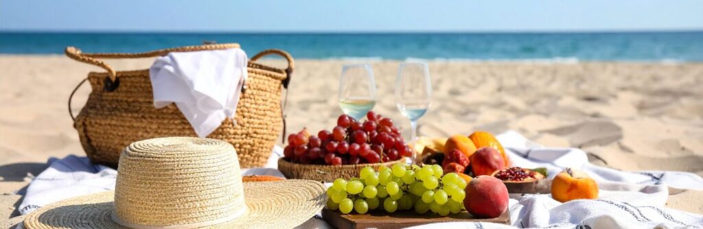 Ilustracja oferty wakacji nad morzem z malowniczą plażą, drzewami i jasnym niebem